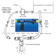 Attaching the suction port on the High Performance Ejector to a Foot Valve & Strainer (sold separately) is recommended to prevent the loss of prime and keep foreign objects from entering the water supply.